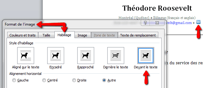 5. Choisissez le format de l’image/habillage: « Devant le texte ».