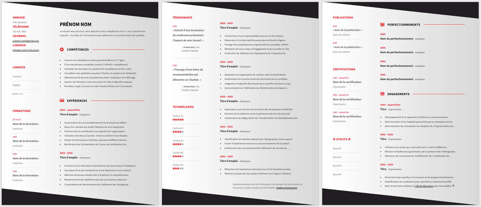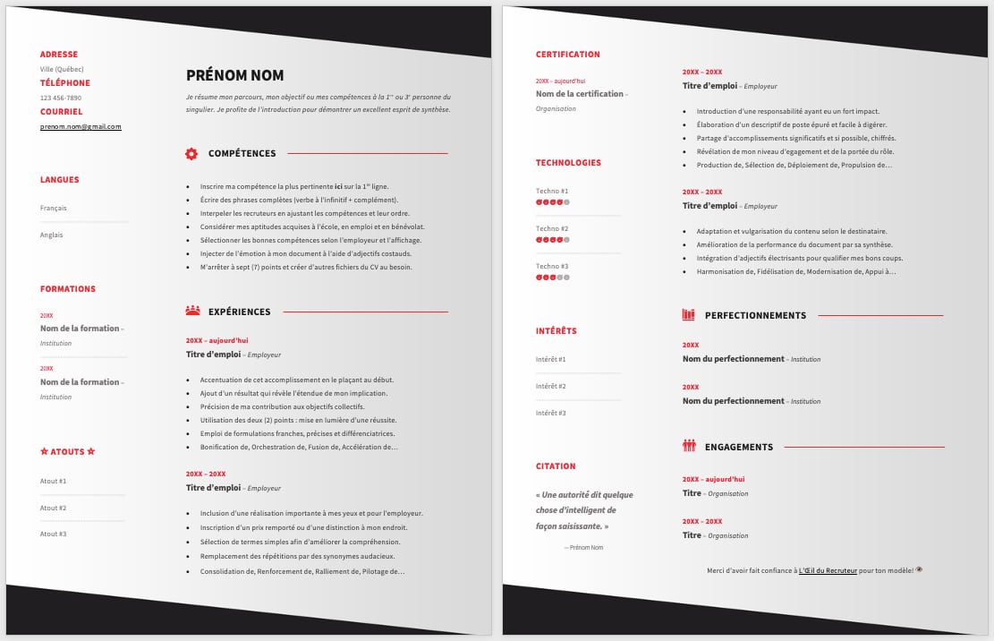 Quel look sobre et distingué! La zone de texte à gauche permet d’insérer une multitude de sections à ton CV.